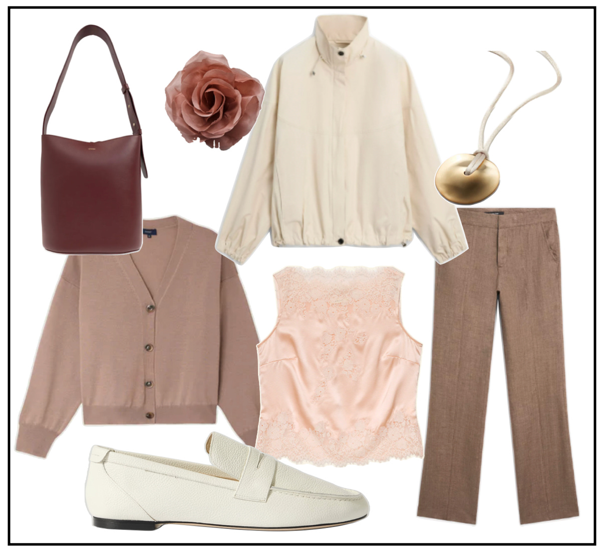 The sun is shining, and you’ve taken a mental health day. Make it special with the silk top under the bomber and the sweater tied at the waist. Accessorize with comfy loafers for mobility, a roomy shoulder bag, a gold pendant necklace, and celebrate the season with an oversized silk rose pinned to the jacket.