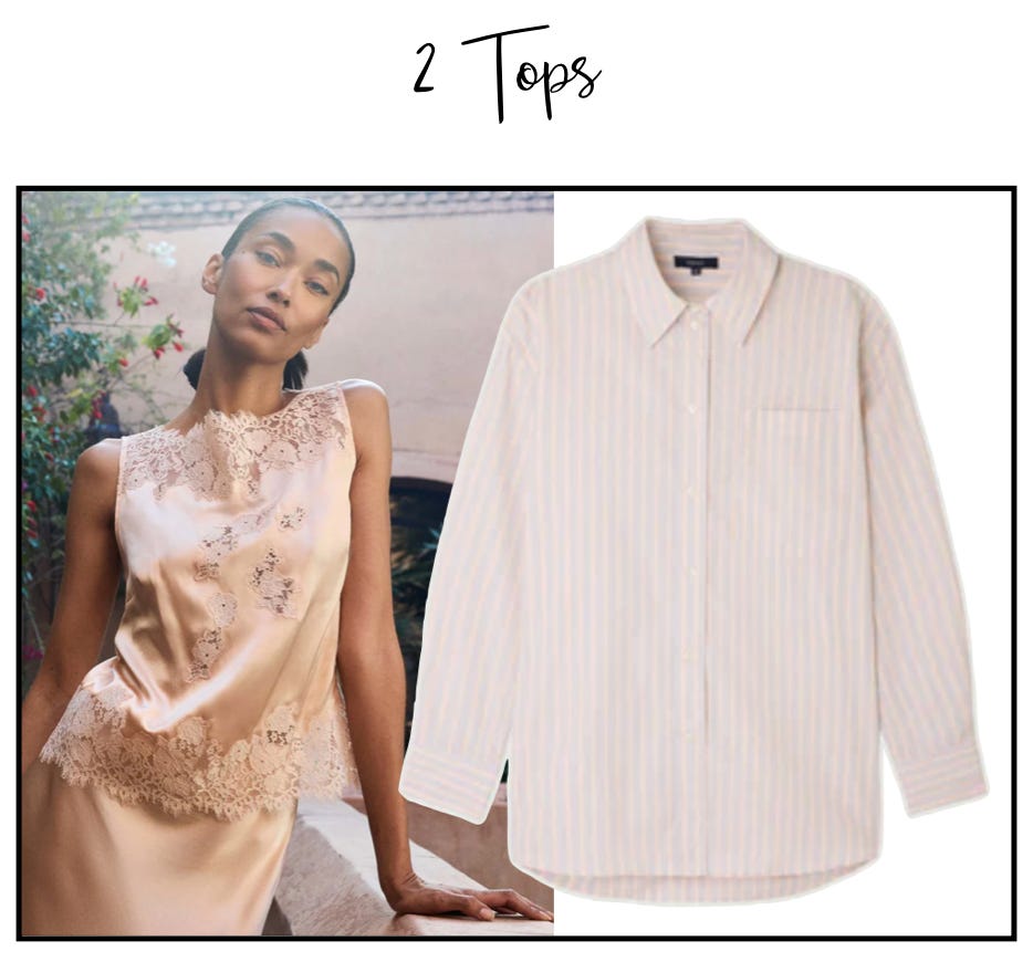 Add these two tops, and you’re ready for anything. The silk and lace top matches the skirt, for a dressed-up look, and easily pairs with both pants. It serves as that all-important first layer for all the above. The muted tones of the stripes in this shirt work well with all the other pieces to provide subtle relief from the solids and variety to the day looks.