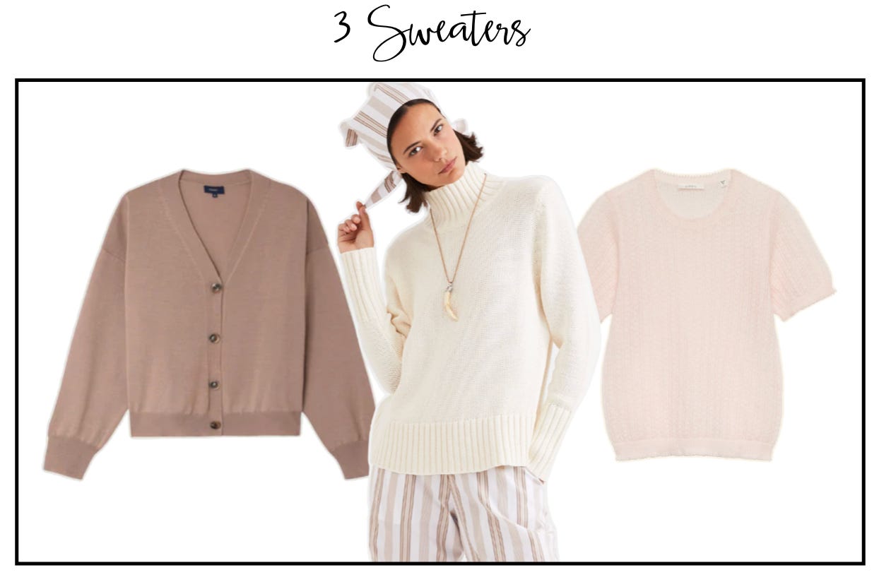 The first cardigan is in fine-gauge merino wool in an interesting shade of dusty pink. It’s a great layering piece and works over all the tops except for the chunky off-white cotton sweater in the center. I love an easy cotton sweater for spring /summer. It’s good to have at least one, and white makes it easy to work with everything. Last is a pretty pointelle-stitch sweater in pale pink. It has the ease of a T-shirt, but elevated.