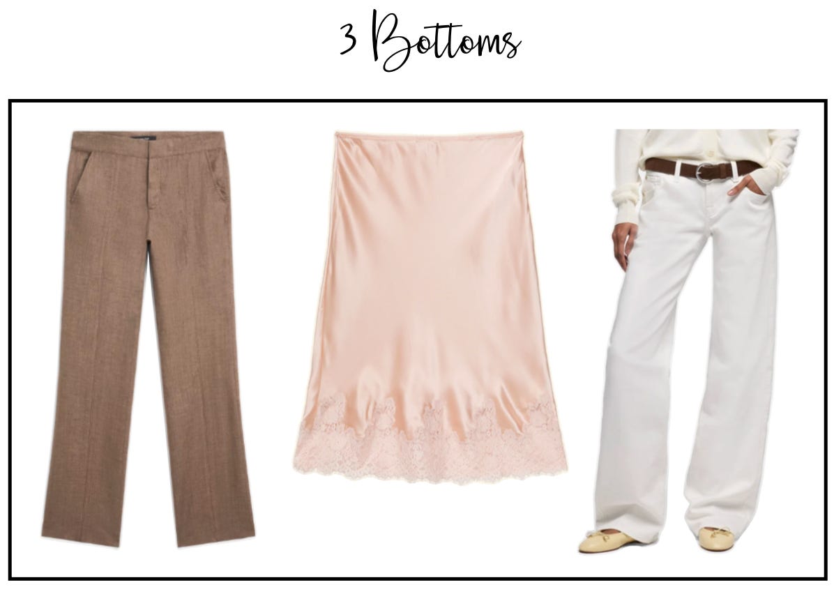 The bottoms cover all bases from casual to dressed up. From left, a pair of linen trousers that can go either way. Next, a knee-length feminine skirt in silk trimmed with lace, and last, wide-leg, low-rise white jeans. This is a must-have for my spring/summer wardrobe. I’m curious to see if I can pull off the low rise. The key is the relaxed leg and to make sure it’s not tight at the waistband. If it’s a fail, I’ll go back to mid-rise. It’s really the silhouette of the leg that counts.