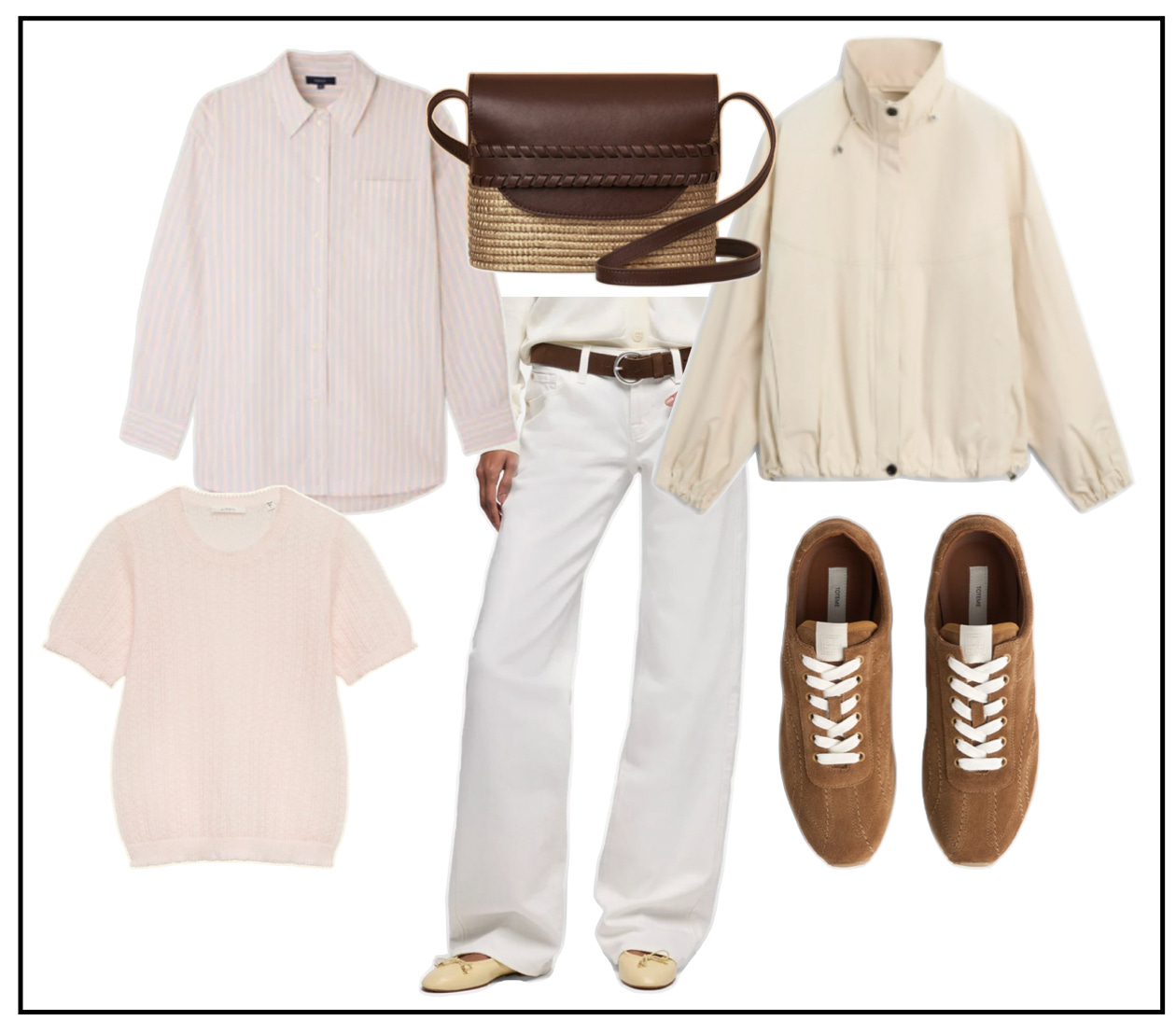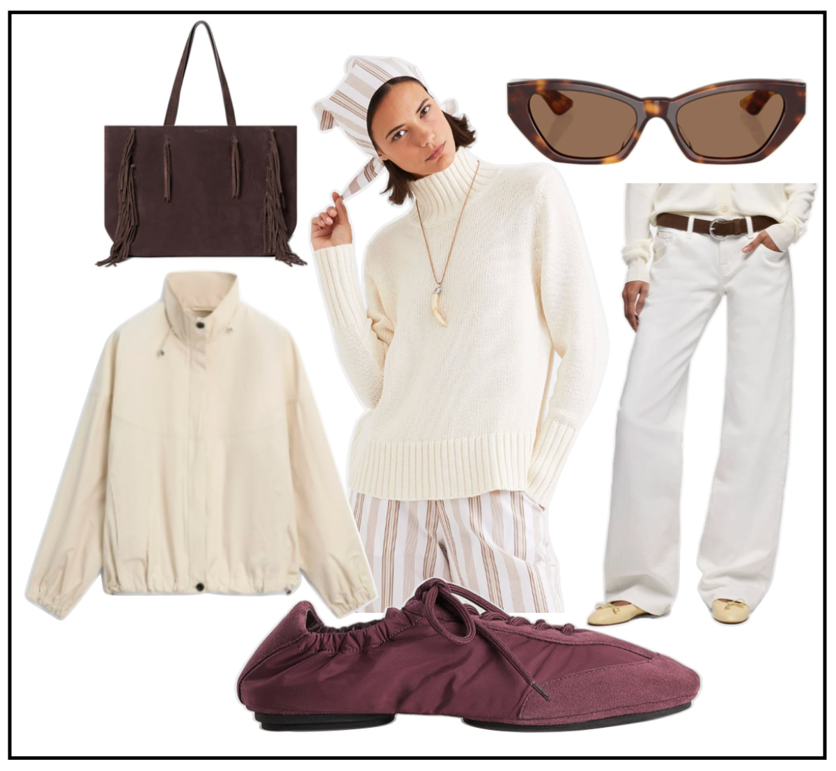 A chilly weekend at the beach is the best time to explore town before the summer crowds emerge. Shades of white give a nod to the season to come. White jeans with the sweater, under the bomber, are comfy and cosy. Add a shot of color with ballet trainers, a fun fringed bag, and tortoise sunglasses, and you’re good to go.
