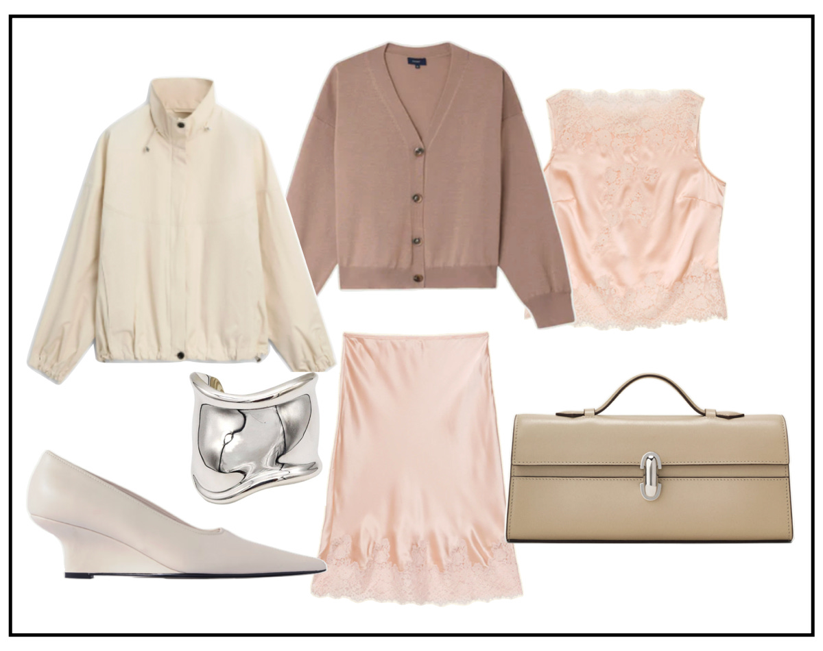 For dinner, dress up while retaining your insouciance. The silk top and skirt are broken up with the cardigan. Button only the two middle buttons and push up the sleeves. The jacket adds edge to the entire look. Shown with an Elsa Peretti cuff, Toteme shoes, and Savette bag.
