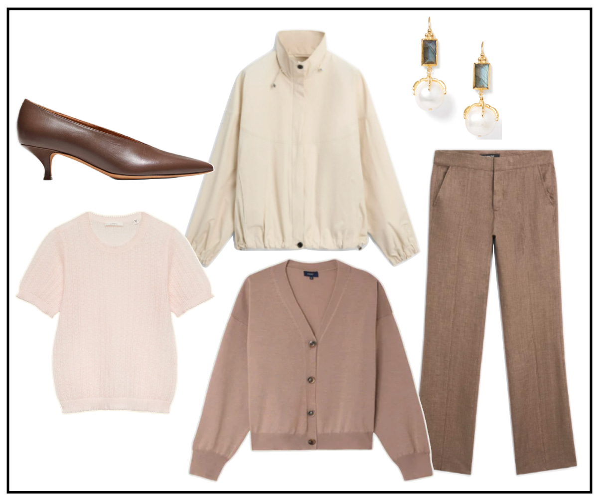 Show you’re a professional without being stuffy at work. Pair the linen trousers with Emma Parsons pumps and pearl earrings. Wear the cardigan unbuttoned over the pointelle sweater after removing the jacket, and push up those sleeves.