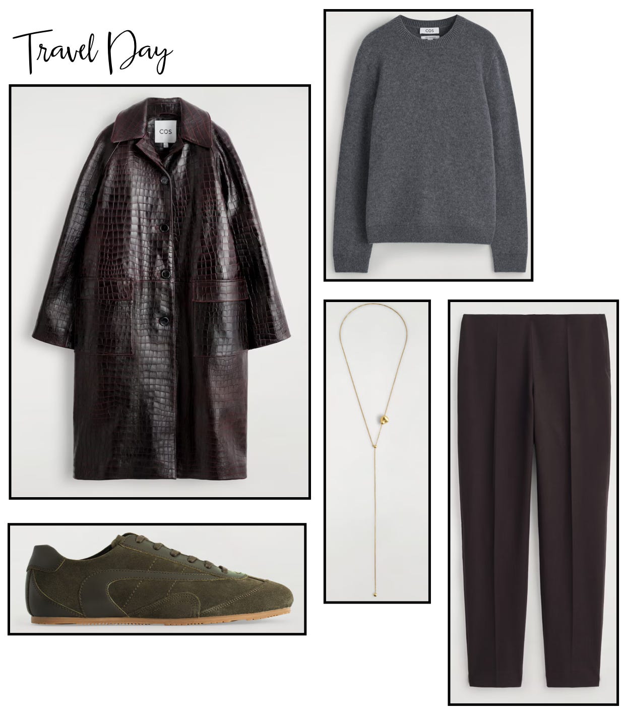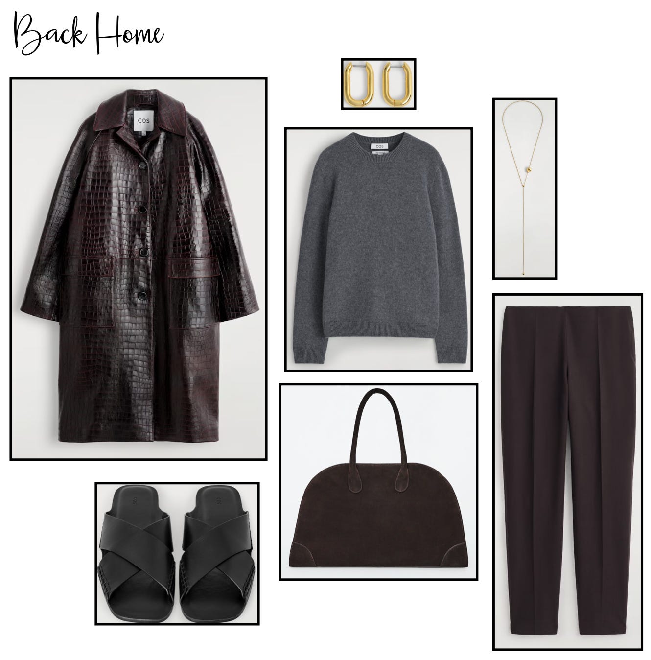 Time to catch your flight home, just swap out the jeans for the slim pants. Lose the shirt, add the coat, and au revoir, Quebec City.