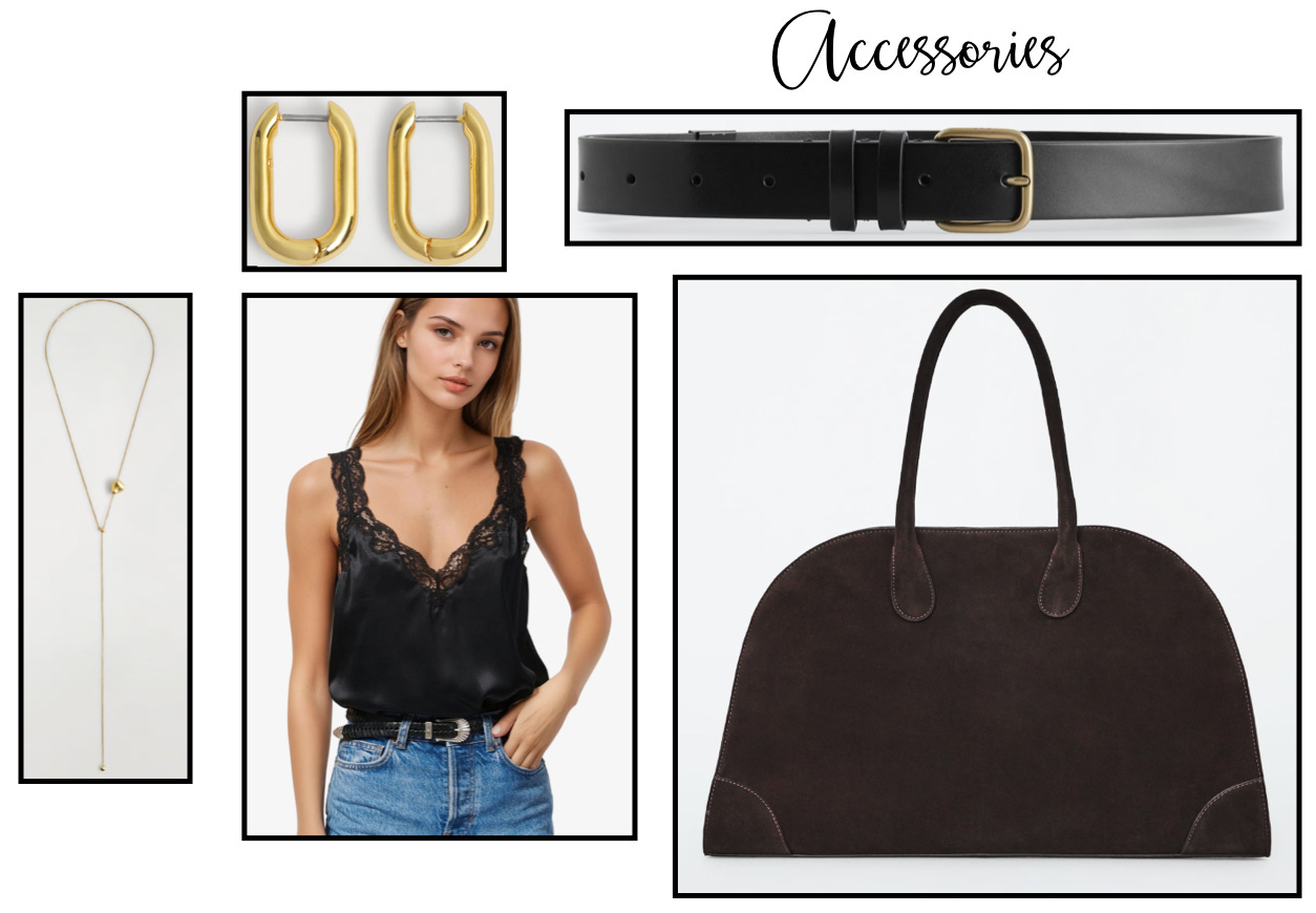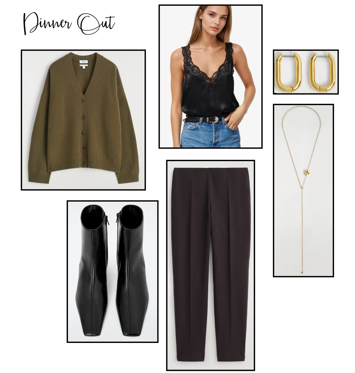 Have a quick turnaround for dinner by swapping the sweater for the silk camisole worn under the cashmere cardigan. Technically, the silk camisole could be considered a top, though I see it as an accessory because it’s not a standalone piece (at least not for me), and it can transform an outfit. It’s a great piece to have in your outfit arsenal. Black makes it a universal. This one is from Cami.