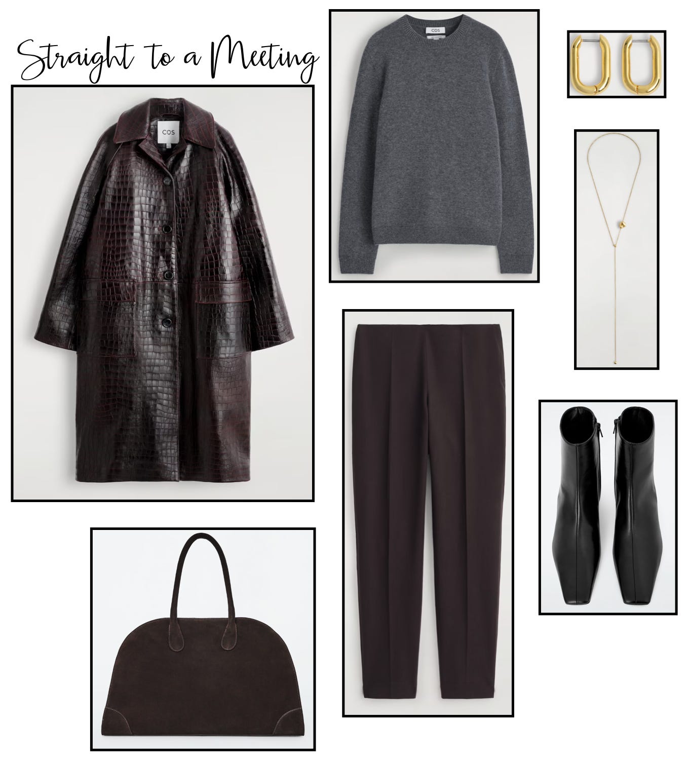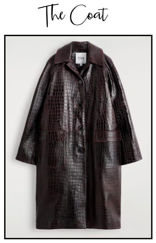 This is the coat that inspired the entire edit. Bravo COS!!! Let’s start with the shape. It works over everything from a sleek sheath with heels to jeans. The color is as easy to mix with as black, but more interesting. I love the crocodile embossed texture, which is a very good replica of the real thing, with the variations and intricacies of the pattern. This is a winning piece to enjoy forever. It will never go out of style and will always be a chic statement piece, and it’s extremely wearable.