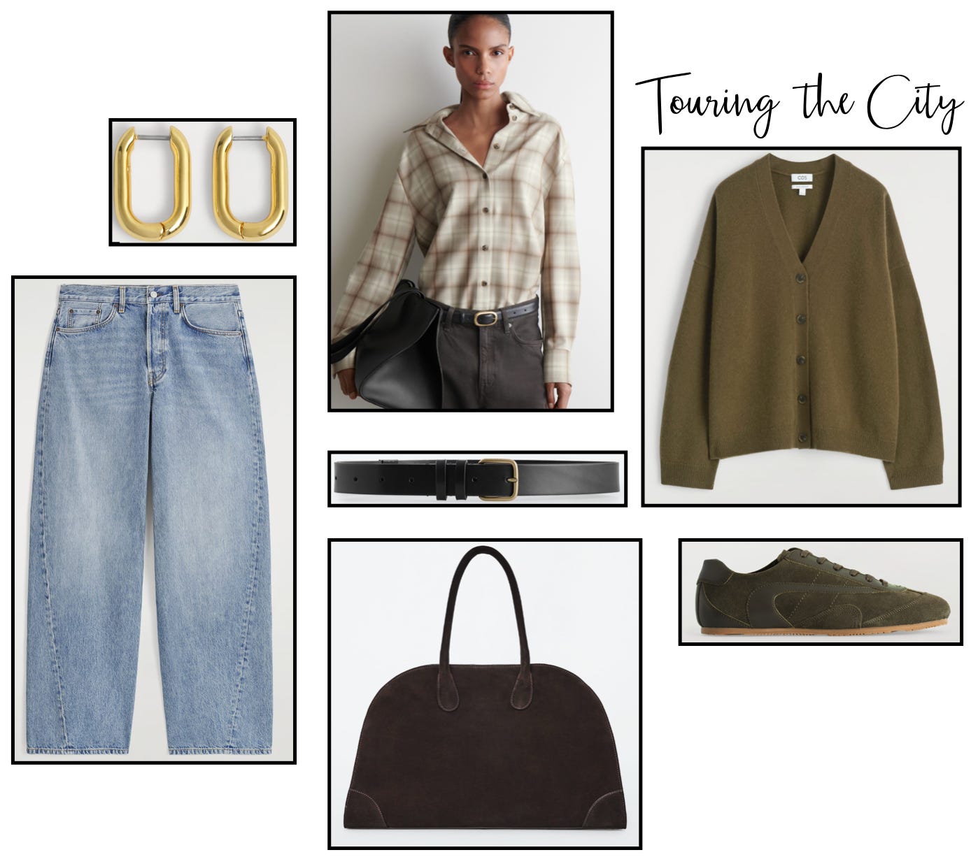 Saturday is your day to explore the city on foot. Comfort is key without sacrificing style. Wear the jeans with the plaid flannel shirt. Early in the day, when it’s chilly, wear the cardigan, then tie it at your waist when it warms up later in the day. The suede sneakers look sleek and can comfortably clock miles all day. Add the bag, belt, and earrings to complete the look.