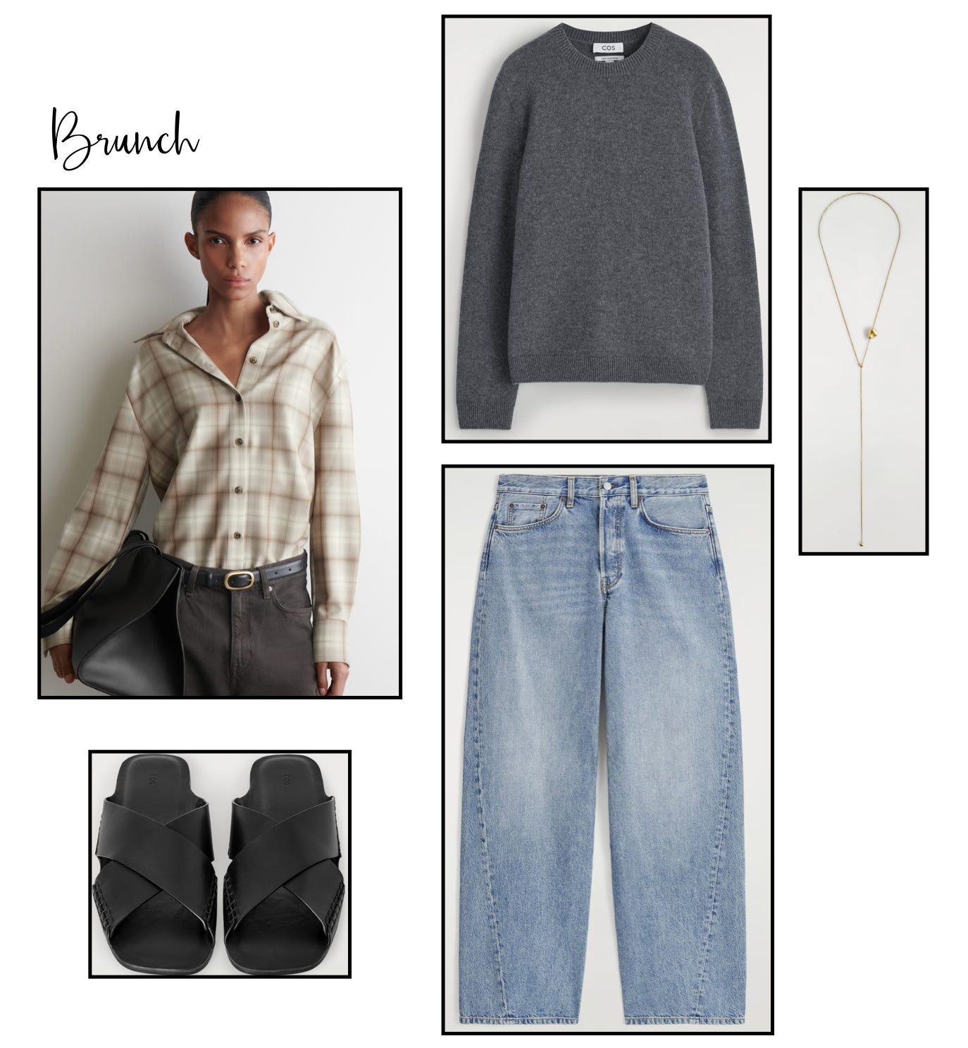 For a laid-back brunch on Sunday, wear the jeans with the cashmere crew and the flannel shirt over the sweater. When it warms up, tie the shirt around your waist. Slide on the sandals and add the necklace. Done.